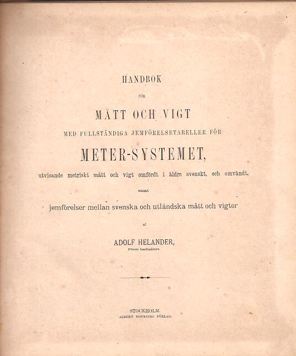 Böcker som liknar Helander, Adolf | HANDBOK FÖR MÅTT OCH VIGT MED FULLSTÄNDIGA JEMFÖRELSETABELLER FÖR METER-SYSTEMET, UTVISANDE METRISKT MÅTT OCH VIGT OMFÖRDT I ÄLDRE SVENSKT, OCH OMVÄNDT, SAMT JEMFÖRELSER MELLAN SVENSKA OCH UTLÄNDSKA MÅTT OCH VIGTER