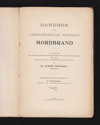 Handbok för undersökningar rörande mordbrand är en detaljerad och informativ text av Albert Weingart, som riktar sig till jurister, tjänstemän inom brandförsäkringsanstalter och andra som arbetar med utredningar efter brandincidenter. Boken, som översattes av E. Swedborg, publicerades första gången 1895 och erbjuder en grundlig genomgång av metoder och riktlinjer för att undersöka brandstiftelser.
