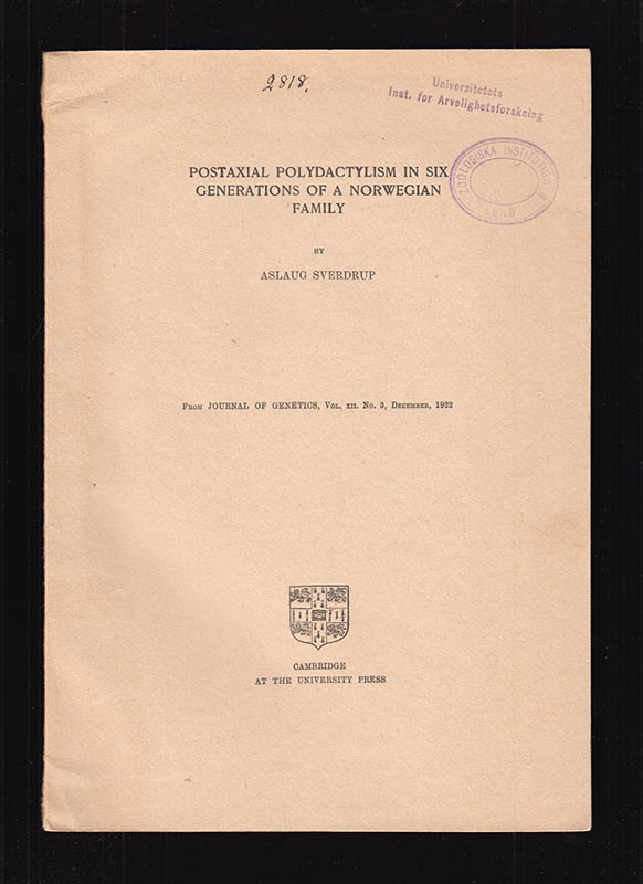 Aslaug Sverdrups bok Postaxial polydactylism in six generations of a Norwegian family publicerad av University Cambridge Press 1922, erbjuder en detaljerad analys av polydaktylism, en genetisk variation som resulterar i extra fingrar eller tår. Boken är illustrerad med sex planscher, varav en är dubbelsidig, samt fem tabeller, två av dem utvecklingsbara, och fyra svartvita fotografier som ytterligare belyser ämnet.