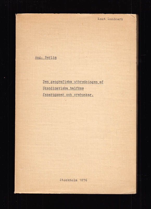 Denna historiska studie, Den geografiska utbredningen af skandinaviska halföns fanerogamer och ormbunkar i tabellarisk öfversigt uppstäld av Johan August Berlin, publicerades av P. A. Norstedt & söner år 1875. Boken är trådhäftad i ett enkelt omslag med maskinskriven titel, och de tryckta originalomslagen är något naggade men har bundits tillsammans. Med sina mått på 24x16 cm är detta en första och enda upplaga av verket, där omslaget trycktes 1876. Inlagan är i fint skick.