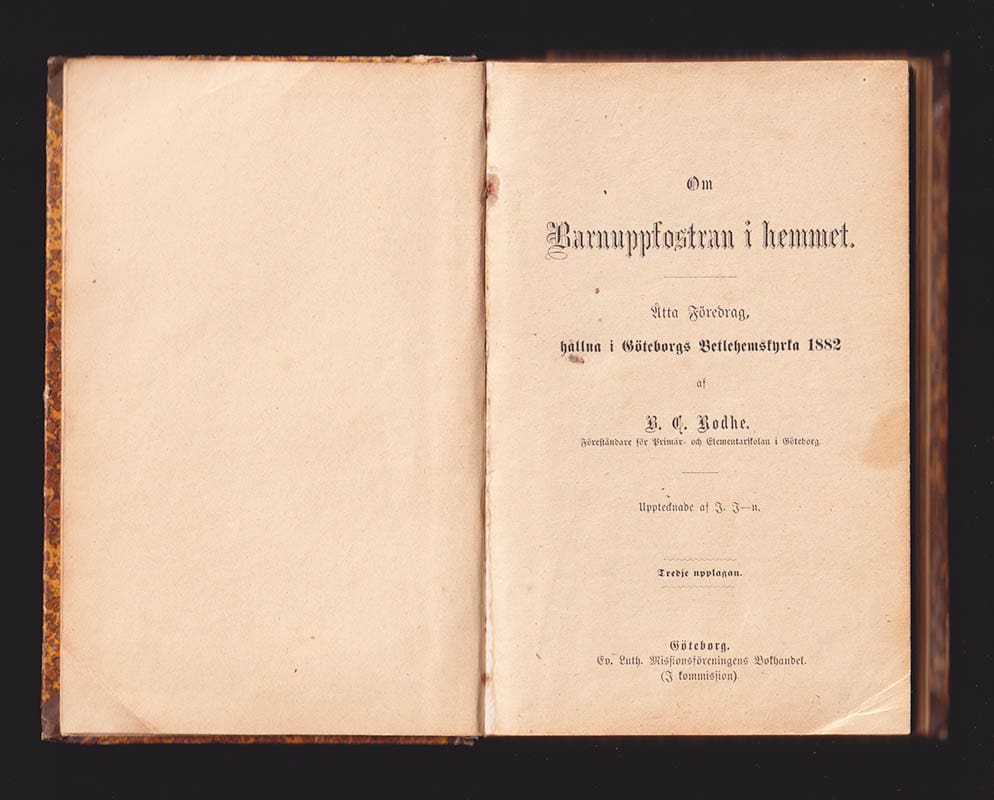 Om barnuppfostran i hemmet. Åtta föredrag hållna i Göteborgs Betlehemskyrka 1882 af B. C. Rodhe är en insiktsfull samling av föredrag som adresserar barnuppfostran ur ett psykologiskt och etiskt perspektiv. Boken, upptecknad av J. J-n och utgiven av Ev. Luth. Missionsföreningens Bokhandel 1884, erbjuder en djupgående analys av hur föräldrar kan forma sina barns karaktär och värderingar. Med sina 216 sidor och en helsidesplansch är detta verk en viktig del av den svenska litteraturen om barnpsykologi och uppfostran.
