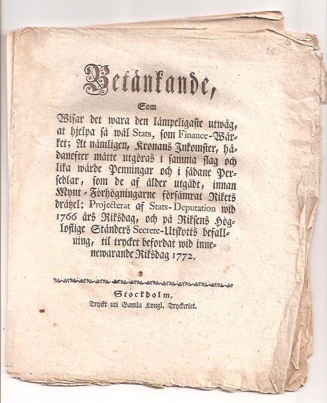 Denna skrift, Betänkande, som wisar det wara den lämpeligaste utwäg, at hjelpa så wäl stats, som finance-wärket, ger en djupgående inblick i de ekonomiska utmaningarna som Sverige stod inför under 1700-talet. Publicerad 1772 av Gamla Kongl. tryckeriet i Stockholm, är detta verk en viktig källa för dem som är intresserade av mynt och numismatik. Skriften omfattar 24 oskurna sidor och behandlar frågor som penningbrist, växelkurs och de effekter som mynt-förhögningar hade på rikets ekonomi.
