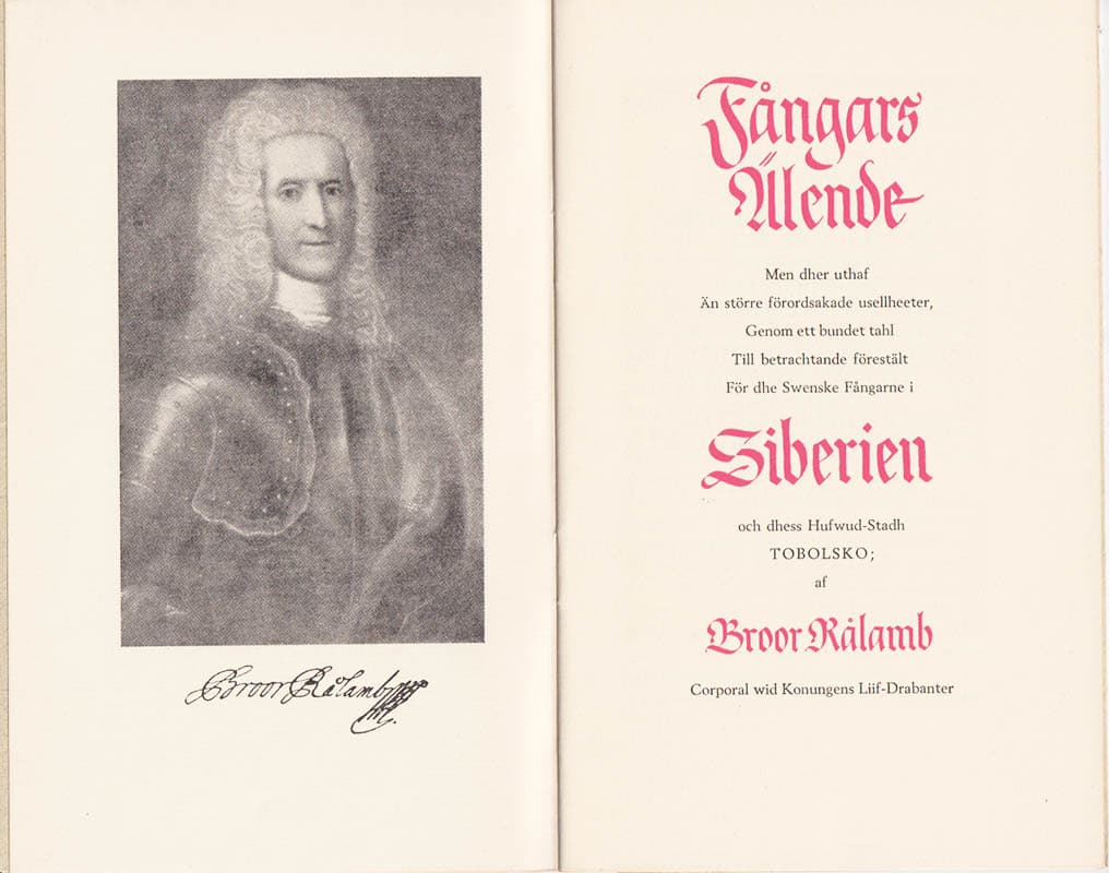 Information om Fångars älende men dher uthaf än större förordsakade usellheeter, Genom ett bundet tahl Till betrachtande förestält För dhe Swenske Fångarne i Sibirien och dhess Hufwud-Stad Tobolsko; af Broor Rålamb, Corporal wid Konungens Liif-Drabanter av Broor Rålamb