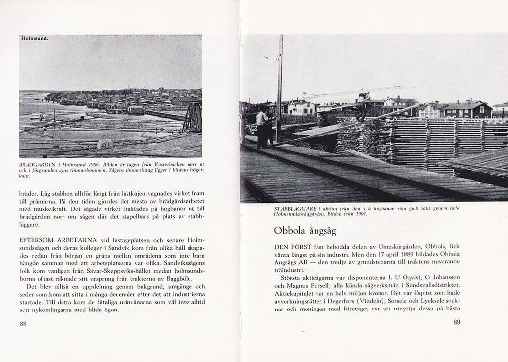 Boken omfattar 288 sidor och är rikt illustrerad med svartvita fotografier, kartor och tabeller. Försättsbladen pryds av ett foto som visar Holmsund år 1903, medan eftersättsbladen innehåller en karta över området. Innehållet sträcker sig över flera aspekter av bygden, såsom kommunens framväxt, jakt och fiske, industri, handel och hantverk, samt kulturella och politiska aspekter av samhället. Det ger en tydlig bild av hur Holmsund har utvecklats och förändrats över tid.