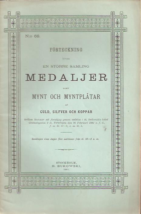 Information om Förteckning öfver en större samling medaljer samt mynt och myntplåtar af guld, silfver och koppar av Bukowski katalog nr 68