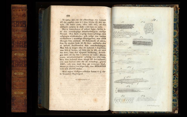 Boken är bunden i ett samtida halvfranskt band med marmorerat pärmpapper. På ryggen finns en präglad dekoration och förgylld ryggdekor, vilket ger den ett elegant utseende. Det är värt att notera att ena falsen har en spricka nertill, men trots detta är planscherna ovanligt rena. Boken mäter 20,5 x 12,5 cm och är genomgående något lagerfläckad, vilket är normalt för äldre verk.