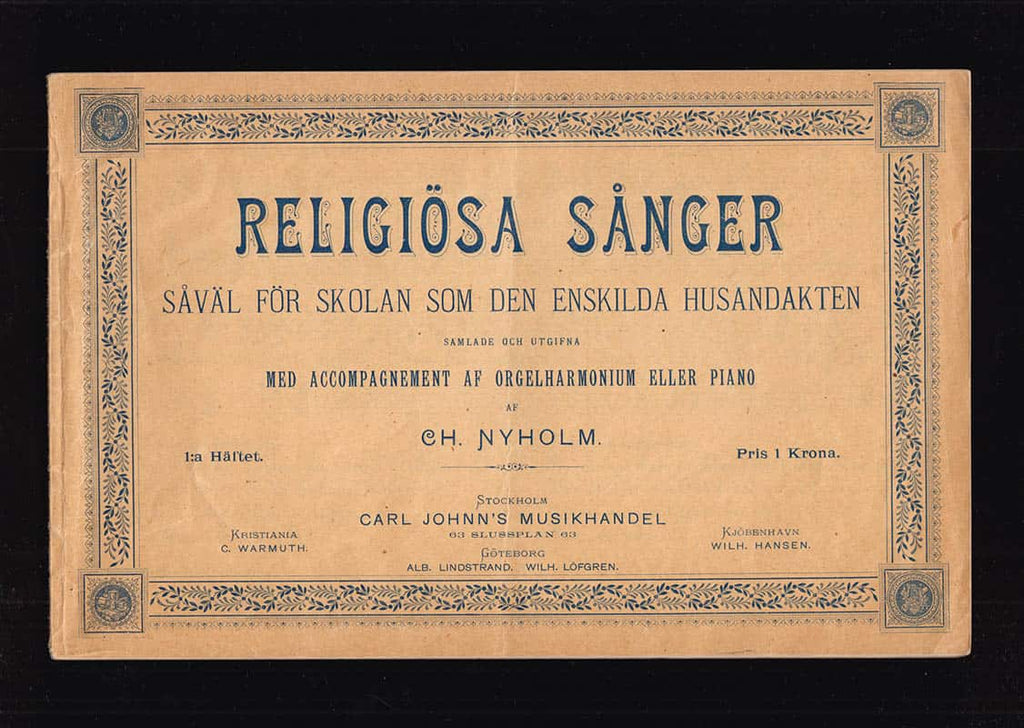 I Religiösa sånger såväl för skolan som den enskilda husandakten. Samlade och utgifna med accompagnement af orgelharmonium eller piano. Första häftet av C H Nyholm presenteras ett urval av tolv sånger, noggrant utvalda för både skolor och privata andaktsstunder. Utgiven av Carl Johnn's Musikhandel i Stockholm, innehåller denna häfte 16 sidor med musiknoter och är illustrerad för att underlätta användningen av sångerna.