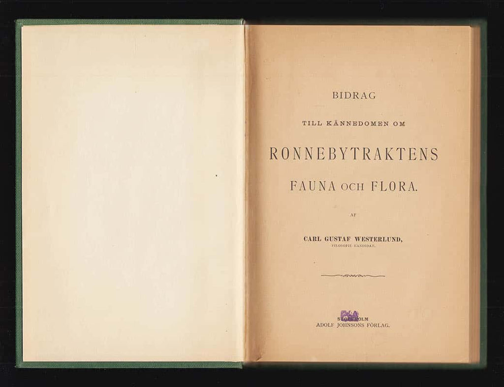 I Bidrag till kännedomen om Ronnebytraktens fauna och flora av Carl Gustaf Westerlund ges en grundlig redogörelse för djur- och växtlivet i Ronneby. Denna första och enda upplaga publicerades 1890 av Adolf Johnsons förlag och trycktes av Almqvist & Wiksells Boktryckeri-Aktiebolag. Boken omfattar 173 sidor och är illustrerad med tabeller som stödjer textens innehåll.