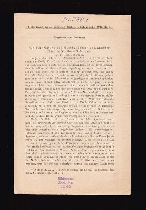 Information om Zur Verbreitung des Moschusochsen und anderer. Tiere in Nordost-Grönland av Conwentz