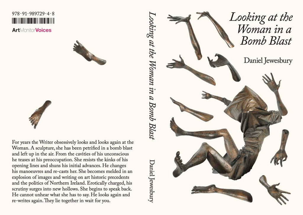A slender young woman falls backwards, blown off her feet by a bomb. Frozen in time, her bare legs stick up, her hands grasping the air. Her face is covered by a page from a newspaper. People approach to look at her, bending down to study the folds of her dress, the immature curve of her thigh, her neat toes, splayed in surprise. The woman is a sculpture, made by the Irish artist F. E. McWilliam in 1974. In this bronze figure’s awkwardly graceful near-death contortions, entire histories of pain, death, sex and visual pleasure have been condensed. Looking at the Woman in a Bomb Blast is an experimental artist’s book that uses different voices to unravel these histories: a writer labours over an elaborate ‘explanation’ of what she means, while the voice of the Woman herself offers acerbic insights and asides. In a series of short chapters, they assert their contrasting ideas, insisting on their own approaches to discovering her ‘true meaning’: by turns affective, confessional, detached and analytical. As the writer looks, and tries to thread together a coherent account, we we are led through formalistic accounts of drapery, gesture, and emotion, and encounter histories of violent and sexualised imagery in Western art, of the nude, and the artist’s model. But, pushing itself forward, increasingly impossible to ignore, is the tension that the work continually performs, between itself, its viewer, and the imagined motivations of its creator: who is looking at whom, whose desire is indulged, what fantasies and pleasures are crystallised in the work? Eventually, the writer confronts the disturbing fetishism that runs through the work like an electrical charge, connecting artist, viewer and woman in a perverse visual contract. Only then do we understand the way the work oscillates, between voyeurism and exhibitionism – between masochistic and sadistic desires. The sculpture becomes simultaneously compelling and repellent – it can make one feel shameful for looking, and guilty for looking away. This female body, suspended at the moment of her death, her skirt lifted above her legs, her face covered by a sheet of newspaper, is complex, banal, mythic, formalistic, attractive, fragile, misogynistic: it exceeds any single attempt to describe it. In tone, the book cuts between a poetic ekphrasis, a visual essay, an art-historical murder mystery, and a pornographic surrealist novella. It’s neither a conventional artist’s book, a novel, nor an academic art history.