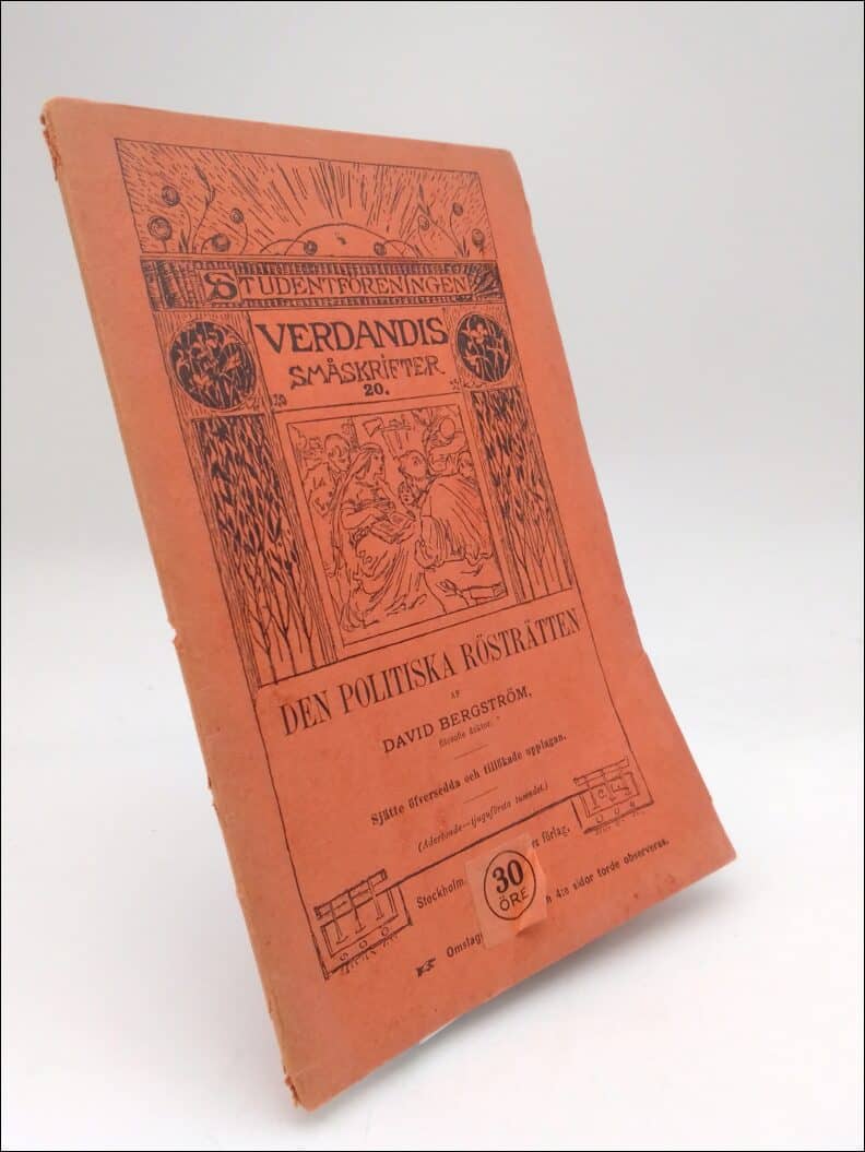 Boken är i något sämre antikvariskt skick, med en äldre prislapp och viss lagernötning. Omslaget är något kantstött och har mindre riss, vilket är värt att notera för samlare. Med sina 50 sidor är Den politiska rösträtten en kompakt och informativ läsning för den som är intresserad av politiska ideologier och demokratins utveckling.