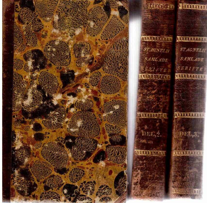 Denna kompletta utgåva är i förlagets tre halvfranska band, som bär spår av lagernötta pärmar och äldre namnteckningar på försättsblad. Inlagorna är något brunfläckade, och det finns en fuktfläck i den tredje volymen, vilket inte påverkar textens läsbarhet. Trots dessa skavanker, kvarstår värdet av Stagnelii's bidrag till den svenska litteraturen, vilket gör denna samling intressant för både forskare och läsare.