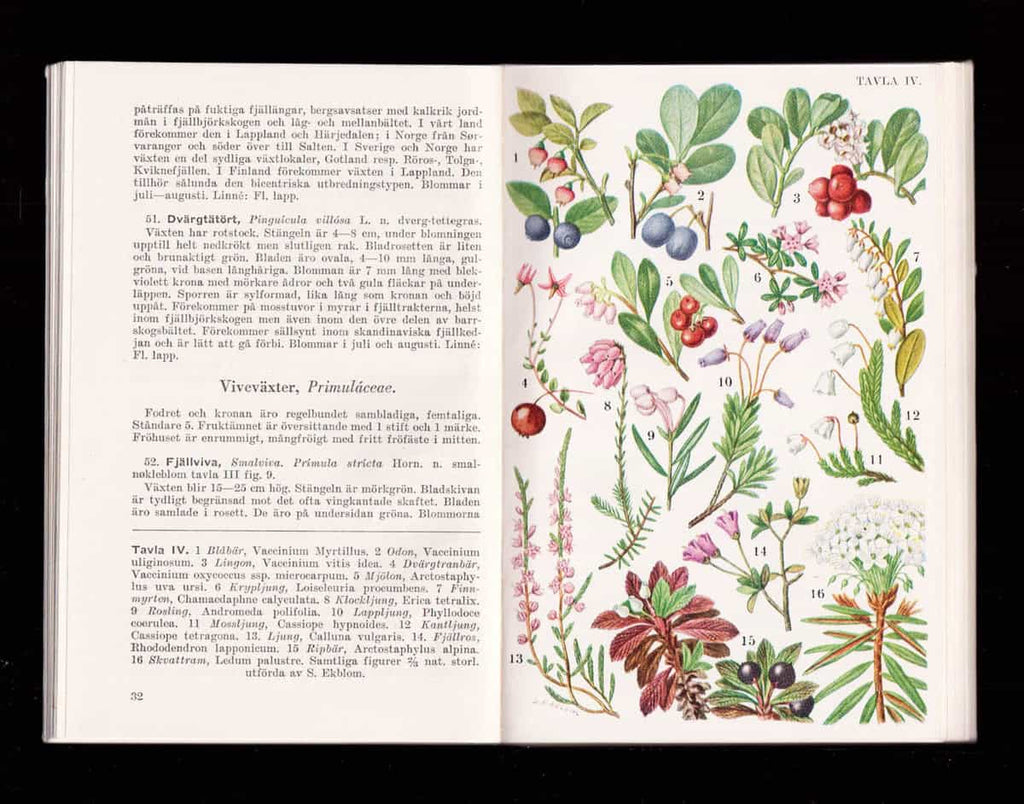 Våra vilda växter och hur man känner igen dem. Illustrerad fickbok. Del I. Fjällväxter av Erik Söderberg är en ovärderlig följeslagare för den som vill lära sig om fjällens flora. Utgiven av Albert Bonniers Förlag 1943, erbjuder denna bok en djupgående insikt i fjällväxternas värld. Med 137 sidor och 12 planschblad, varav 8 är i färg, ger den en visuell och informativ presentation av växterna som pryder de svenska fjällen.
