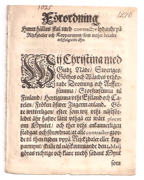 Förordning huru hållas skal med Contracter lydande på Rijckzdaler och Kopparmynt, som inthet betalte och fulgiorde ähre är en fascinerande skrift från 1642, tryckt vid det Kungliga tryckeriet i Stockholm. Denna text erbjuder en inblick i det tidiga svenska penningväsendet och hur mynt reglerades under denna period.