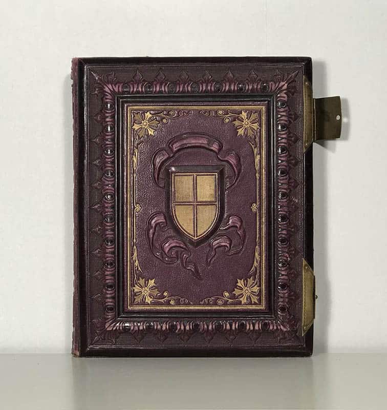 Det vinröda albumet är präglat i jugendstil och har markerade bind, med en förgylld pärmdekor och snitt. De bevarade mässingsspännena ger en extra dimension av elegans, även om stiftet till det främre övre bindet saknas. Det finns små skador på översta bindet och mellanrummet till det andra, vilket är vanligt för objekt av denna ålder. Albumets mått är [25,5x20,5 cm].