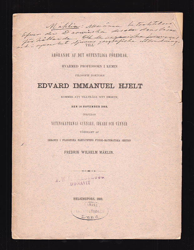 Fredrik Wilhelm Mäklins verk Allmänna betraktelser öfver den darwin'ska descendenslärans förhållande till de organiska formernas och i synnerhet djurens geografiska utbredning. Coleoptera erbjuder en insiktsfull analys av hur den darwinistiska teorin relaterar till djurens spridning över olika geografiska områden. Publicerad 1882 av J. C. Frenckell & Son i Helsingfors, boken sträcker sig över 64 sidor och är trådhäftad med tryckta originalomslag. Omslaget bär spår av tidens gång, med naggade kanter och en samtida handskriven titel.