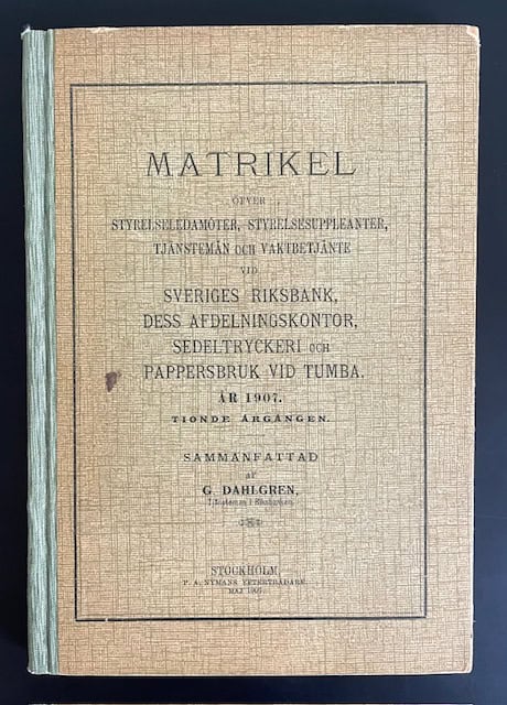 Upptäck Matrikel öfver styrelseledamöter, styrelsesuppleanter, tjänstemän och vaktbetjänte vid Sveriges Riksbank, dess afdelningskontor, sedeltryckeri och pappersbruk vid Tumba: År 1908 av G. Dahlgren. Denna publikation ger en detaljerad översikt över Riksbankens ledning och personal, inklusive vaktpersonal och anställda vid sedeltryckeriet och pappersbruket i Tumba. Boken är en värdefull källa för den som är intresserad av bankverksamhet och ekonomi i Sverige under tidigt 1900-tal.