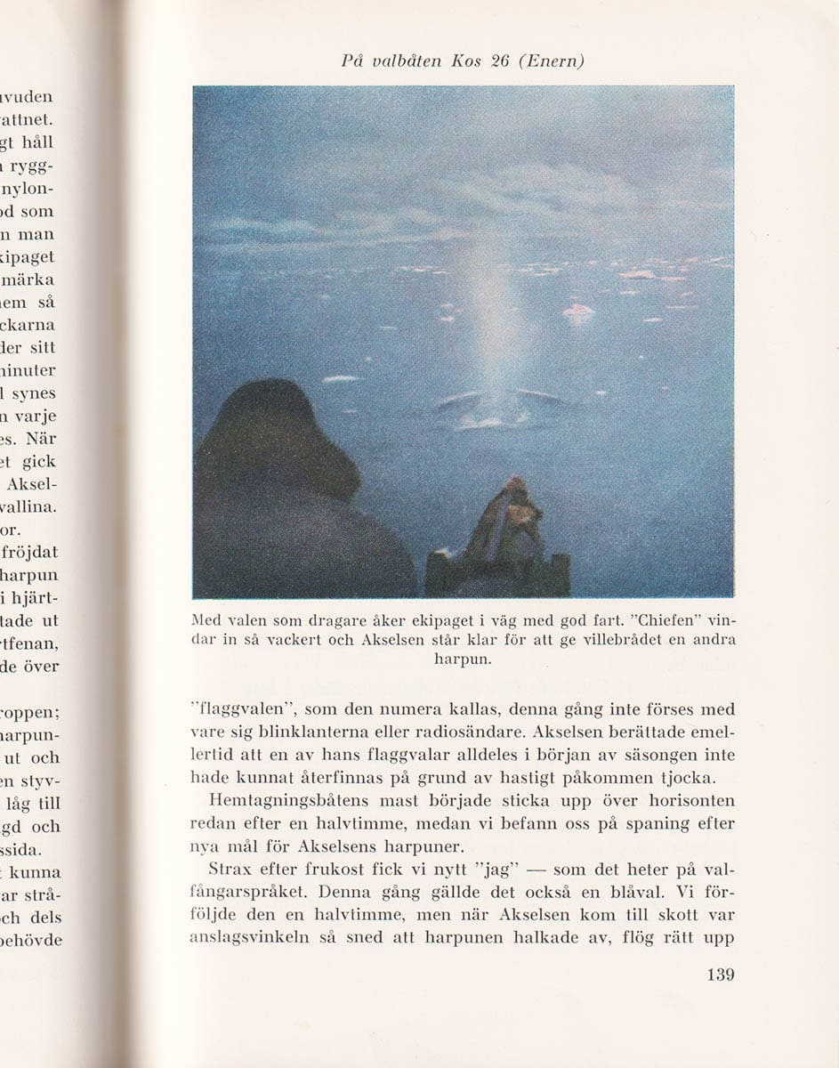 Albert Bonniers Förlag, Stockholm 1950. Titelplansch i färg 'En hemtagningsbåt Kos (Tiern) levererar 4 fenvalar' + 289,[1] sidor + ett femtiotal fotografier i s/v och färg, två utvikbara kartor samt en kommentardel med statistikuppgifter om valfångsten 1894 och framåt. Boken är ett trådhäftat band och är i fint skick.