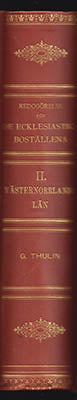 Gabriel Thulins verk, Redogörelse: för de ecklesiastika boställena. II. Västernorrlands län, erbjuder en grundlig genomgång av präster och deras boställen i Västernorrland. Denna bok, utgiven av K. L. Beckmans Boktryckeri 1906, sträcker sig över 547 sidor och är skriven på svenska. Med sitt mörkbruna klotband och förgyllda dekor på ryggen, framstår boken som en vacker antikvitet.