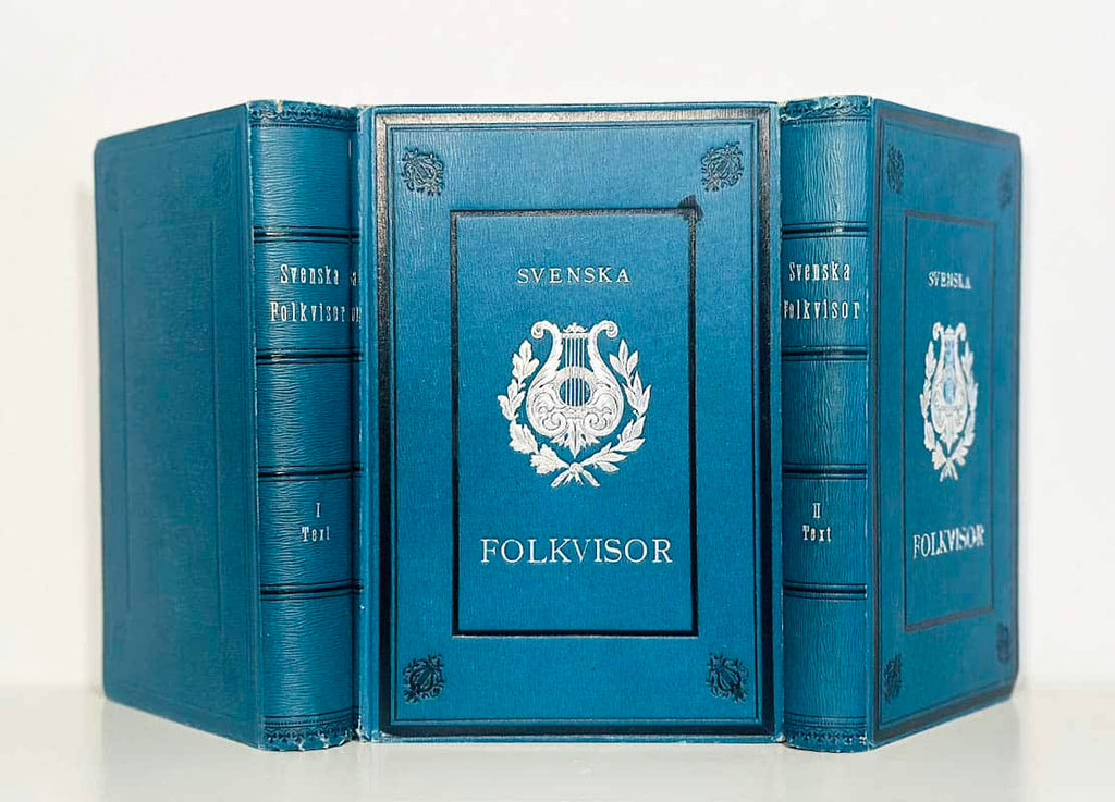 Utgivna af E. G. Geijer och A. A. Afzelius. Ny, betydligt tillökad upplaga, utgifven av R Bergström och L Höijer. Z. Haeggströms förlagsaktiebolag, Stockholm 1880. xxxii,536 + xvi,447,[1 blank] + xvi,216 sidor. Med graverade extra titelblad av W Meyer. Förlagets blindpressade blå klotband med pärm- och ryggdekor i silver och svart och stänkmarmorerade ljusröda snitt. [23x15 cm]. Komplett i tre välhållna volymer med fin inlaga. Första upplagan utkom 1814-16. - Del I. Text. Del II. Anmärkningar. Del III. Musik. I samtliga delars paginering ingår var sin graverad titelplansch. Den första utgåvan av Geijers och Afzelius samling utkom 1814-18.
