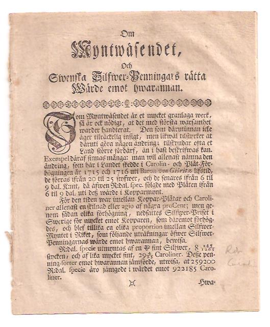 Boken är i normalt antikvariskt skick och består av 8 sidor. Den är häftad och har tagits ur band. Några blyertanteckningar finns i marginalerna på sidorna 2 och 3, vilket kan ge en intressant dimension till läsupplevelsen. Utgiven av Lars Salvius i Stockholm 1765, är denna upplaga en del av en viktig diskussion om mynt och ekonomi i Sverige.