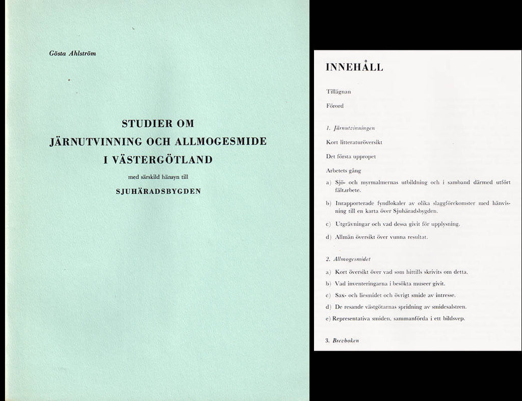 Denna historiska studie, Studier om järnutvinning och allmogesmide i Västergötland med särskild hänsyn till Sjuhäradsbygden av Gösta Ahlström, utforskar järnframställningens betydelse i regionen. Boken, utgiven av Tryckericentralen i Borås 1970, omfattar 44 sidor och är illustrerad med fem svartvita fotoporträtt. Den är klammerhäftad och i fint skick.