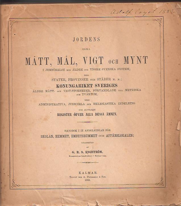 Information om Jordens olika mått, mål, vigt och mynt i jemförelse med äldre och yngre svenska system av Gottfrid Rudolf Salomon Engström