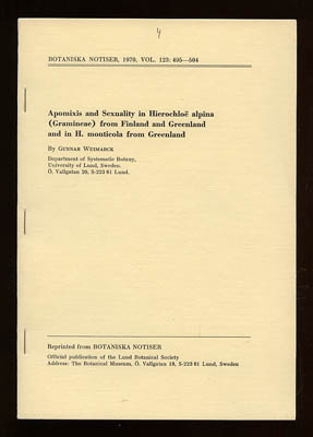 I Apomixis and Sexuality in Hierochloë alpina (Gramineae) from Finland and Greenland and in H. monticola from Greenland utforskar författaren Gunnar Weimarck viktiga aspekter av reproduktion i gräsarter. Boken, som publicerades i Botaniska Notiser 1970, belyser apomixis och dess roll i arternas livscykler. Genom att fokusera på Hierochloë alpina och H. monticola, ger Weimarck en djupgående analys av dessa växters reproduktiva strategier i de kalla och utmanande miljöerna i Grönland och Finland.