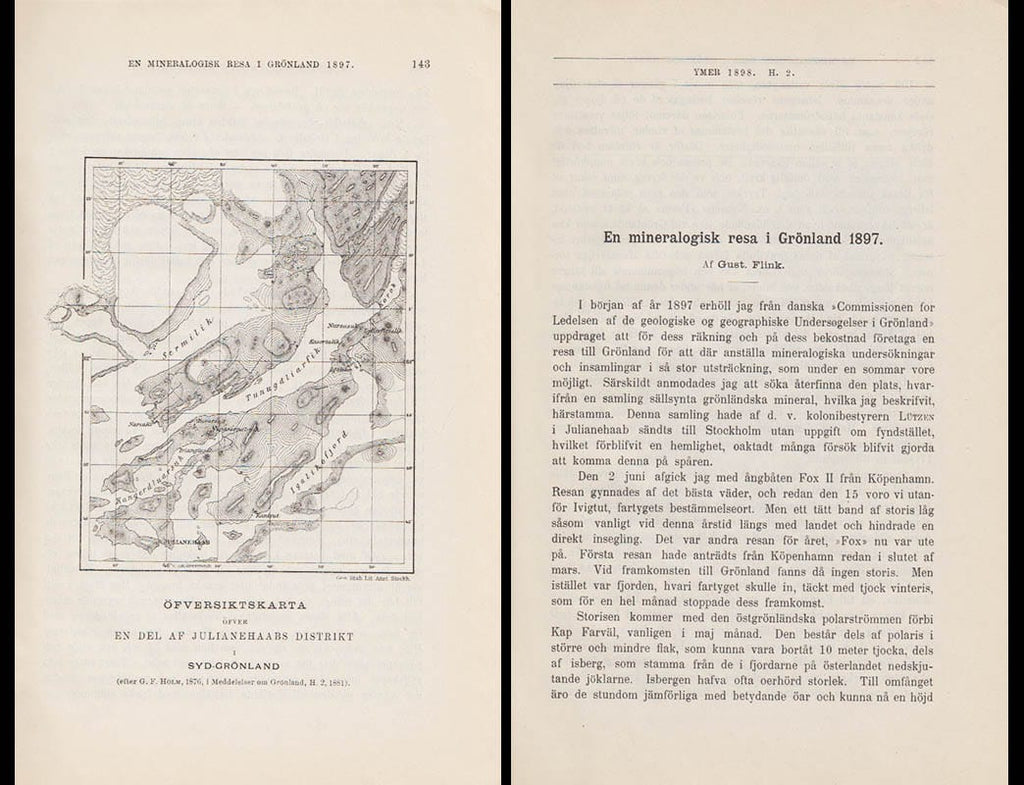 Denna historiska studie, En mineralogisk resa i Grönland 1897, av Gustaf Flink, publicerades av Svenska Sällskapet för Antropologi och Geografi år 1898. Boken är en del av tidskriften Ymer och ger en detaljerad redogörelse för Flinks expedition till Grönland, där han hade som uppdrag att lokalisera ursprungsorten för den Lutzenska samlingen. Flink lyckades påträffa den plats där mineralerna hade sitt ursprung, vilket resulterade i en betydande insamling av sällsynta mineraler.