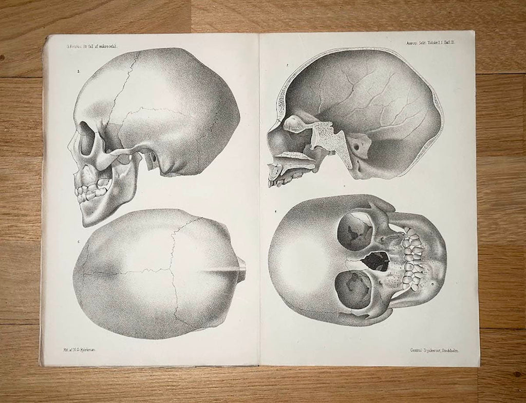 Boken är trådhäftad och ouppskuren, vilket ger den ett antikvariskt värde. Planschen är i gott skick, ren och fri från fläckar, vilket är värt att notera för samlare. Retzius behandlar mikrocefali, en tillstånd som kan orsakas av olika faktorer under fosterutvecklingen och de tidiga levnadsåren, vilket resulterar i en mindre hjärna och potentiellt intellektuell funktionsnedsättning. Genom att kombinera vetenskapliga observationer och illustrationer, bidrar Retzius till en djupare förståelse för tillståndet och dess konsekvenser.
