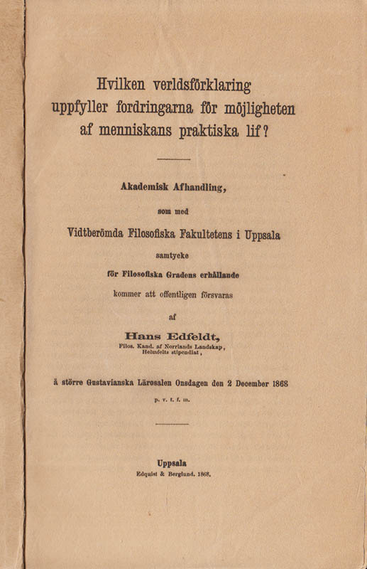 Information om Hvilken verldsförklaring uppfyller fordringarna för möjligheten af menniskans praktiska lif? Akademisk Afhandling, som med Vidtberömda Filosofiska Fakultetens i Uppsala samtycke för Filosofiska Gradens erhållande kommer att offentligen försvaras af, Hans Edfeldt, Filos. Kand. af Norrlands Landskap Helmfelts stipendiat, å Större Gustavianska Lärosalen Onsdagen den 2 December 1868 p. v. t. f. m. av Hans Edfeldt