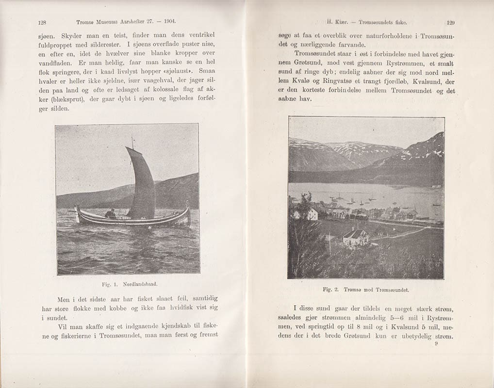 Om Tromsøsundets fiske av Hans Kiær är en grundlig undersökning av fiskebeståndet i Tromsøsundet, publicerad av Tromsø Museum år 1905. Denna vetenskapliga skrift är illustrerad med fyra svartvita fotografier och innehåller elva tabeller som presenterar data relaterade till den lokala faunan och fisket. Boken är klammerhäftad med tryckta originalomslag och är ouppskuren, vilket ger en känsla av att bevara dess ursprungliga skick.