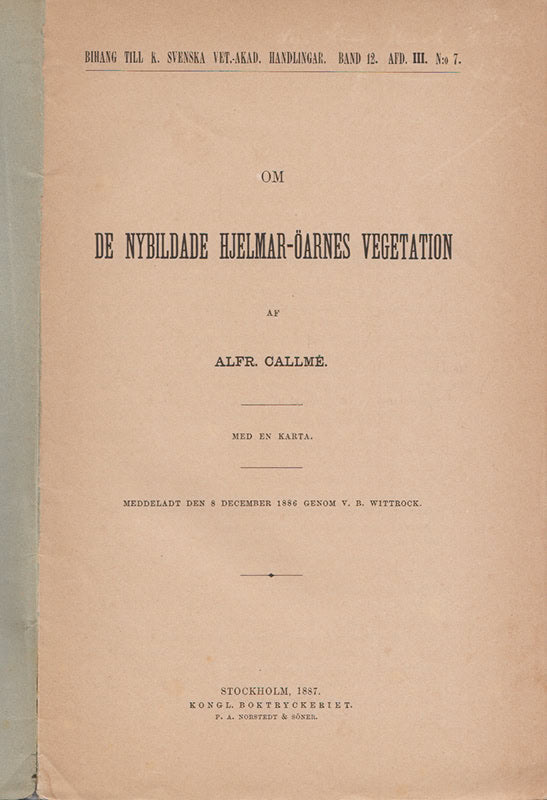 Denna historiska studie, Om de nybildade Hjelmar-öarnes vegetation. Med en karta, av Herman Alfred Callmé, publicerades 1887 och erbjuder en noggrann analys av vegetationen i Hjelmar-öarna. Meddelandet gjordes av V. B. Wittrock och boken är en del av Bihang till K. Svenska Vetenskaps-Akademiens Handlingar.