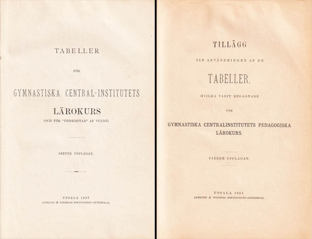 Information om Tillägg vid användningen af de tabeller, hvilka varit begagnade för gymnastiska centralinstitutets pedagogiska lärokurs + Tabeller för gymnastiska central-institutets lärokurs (och för 'friskrotar' af vuxne) av Hjalmar Ling