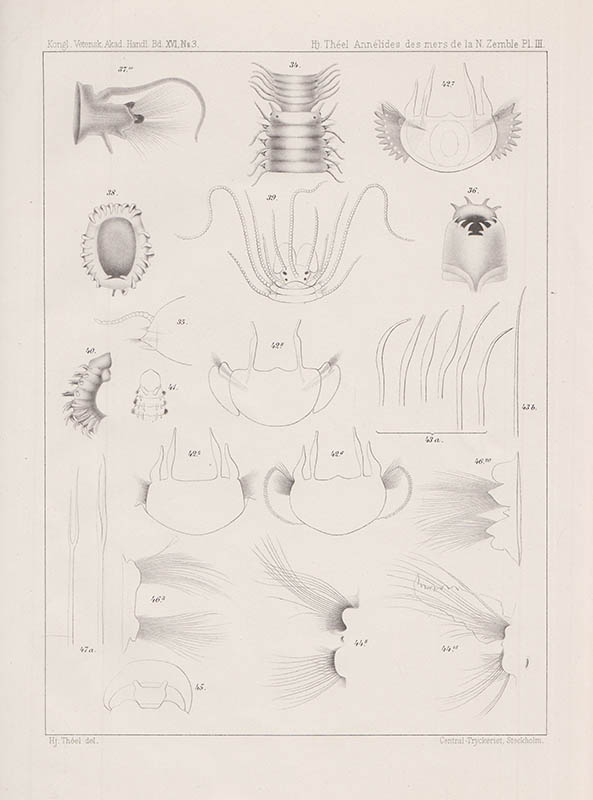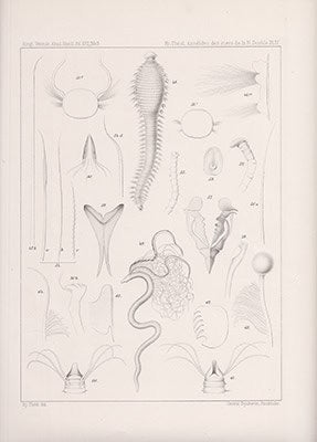 Denna historiska studie, Annélides polychetes des mers de la nouvelle-zemble. Avec quatre plansches av Hjalmar Théel, publicerades 1879 och erbjuder en djupgående analys av polycheta annelider från Novaja Zemlja. Boken innehåller 75 sidor och fyra litograferade planscher som illustrerar dessa intressanta organismer. Den är trådhäftad och delvis ouppskuren, vilket ger en känsla av dess tidiga tryck.