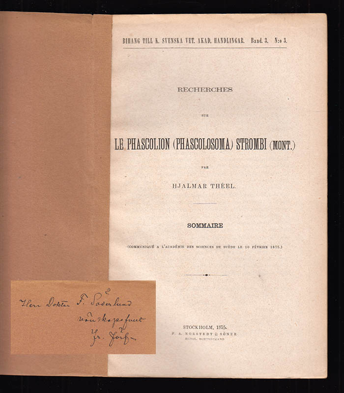 Recherches sur le Phascolion Strombi (Mont.). Sommaire är en vetenskaplig publikation av Hjalmar Théel, utgiven av P. A. Norstedt & Söner 1880. Denna publikation omfattar 7 sidor och är trådhäftad med blanka omslag, vilket gör den till en intressant del av zoologisk litteratur. Med sina mått på 22x13,5 cm och författarens dedikation, erbjuder den en personlig touch till verket.