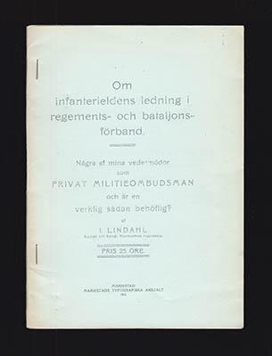 Med över 15 års tjänstgöring vid I 19 i Notviken, framhäver Lindahl sin roll som privat militieombudsman. Boken är en faksimil av första och enda upplagan, publicerad av Mariestads Typografiska Anstalt 1911. Med sina 23 sidor och klammerhäftad äldre stencil, är den ett intressant dokument för den som studerar militaria och krigshistoria.