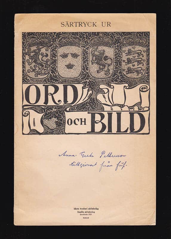 Iduns tryckeri AB, Stockholm 1951. Häftad med tryckta originalomslag. [25x 16,5 cm]. Med författarens dedikation. - [Särtryck ur Ord och Bild, 60:e årg 1951, sid. 316-323].