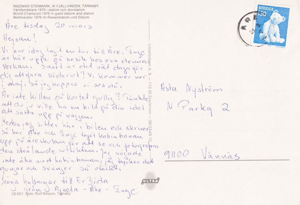 Texten på baksidan av vykortet framhäver Stenmarks prestationer som världsmästare i både slalom och storslalom under 1978. Med tre språk representerade – svenska, engelska och tyska – betonas hans internationella status och betydelse inom skidsport. Detta vykort är inte bara en hyllning till hans karriär, utan också en del av Sveriges idrottshistoria.