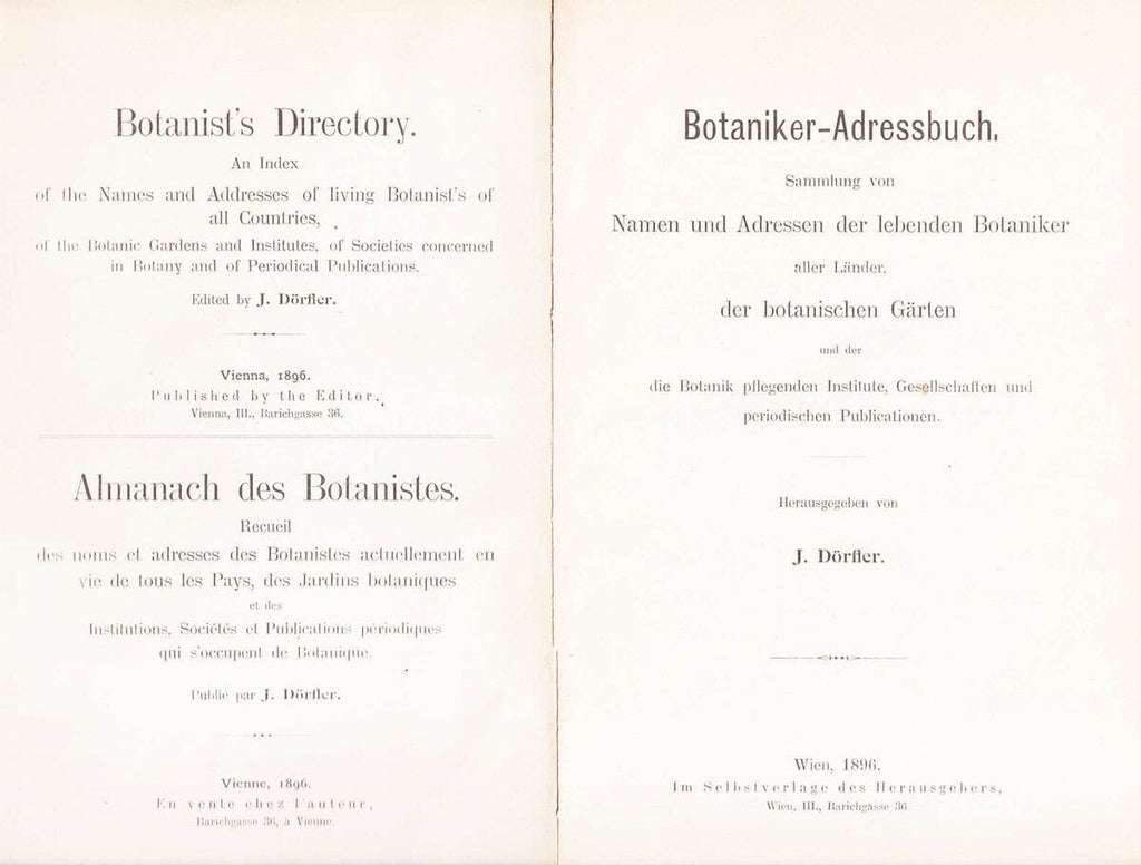 Botaniker-Adressbuch Sammlung von Namen und Adressen der lebenden Botaniker aller Länder, der botanischen Gärten und der die Botanik pflegenden Institute, Gesellschaften und periodischen Publicationen av J. Dörfler är en grundläggande resurs för alla som är intresserade av botanik. Utgiven 1896, erbjuder denna katalog en detaljerad översikt över 6 455 adresser till nu levande botaniker, botaniska trädgårdar och relevanta institutioner världen över.