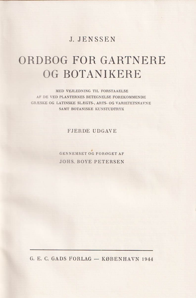 Information om Ordbog for gartnere og botanikere. Med vejledning til forstaaelse af de ved planternes betegnelse forekommende græske og latinske slægts-, arts- og varietetsnavne samt botaniske kunstudtryk av J Jenssen