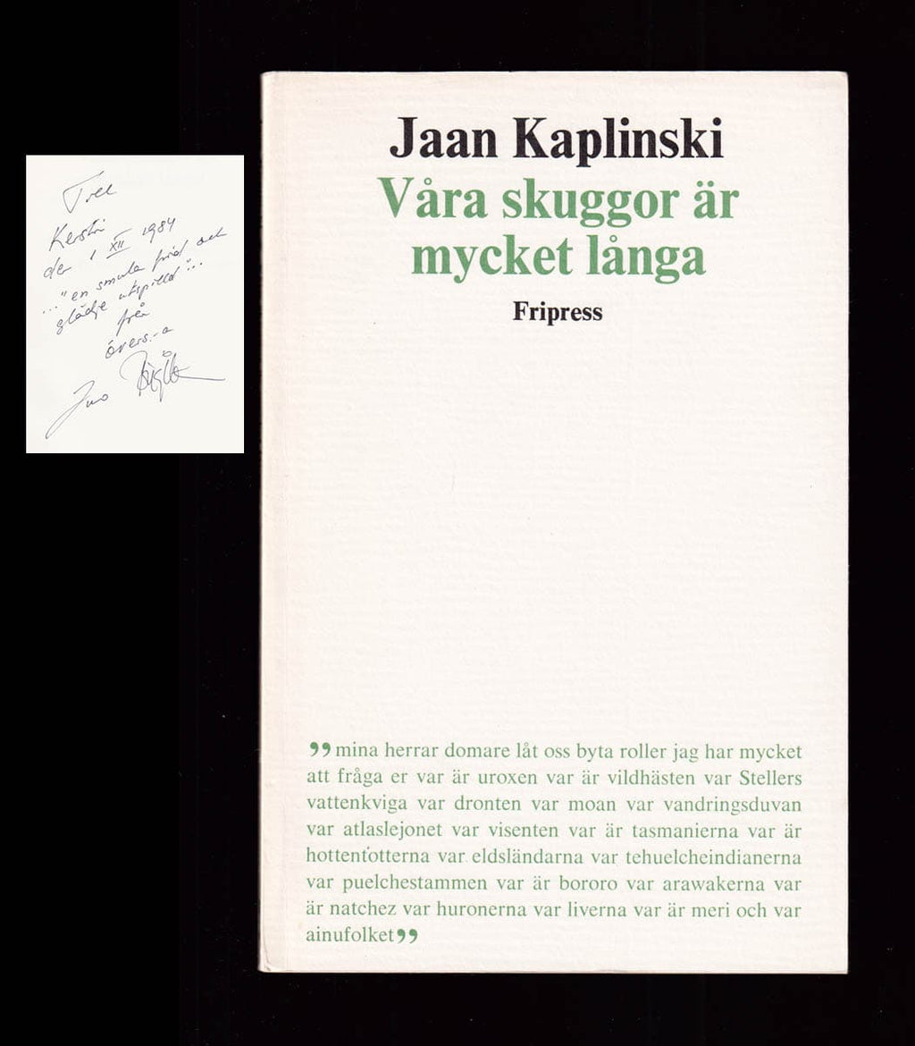 Våra skuggor är mycket långa: dikter är en samling av den estniska författaren Jaan Kaplinski. Med sin bakgrund i lingvistik och journalistik erbjuder han en unik röst i den estniska litteraturen. Hans poesi utforskar teman av identitet och samhällsfrågor, med djupa reflektioner och känslor. Boken publicerades 1982 och är i mycket fint antikvariskt skick, vilket gör den till en intressant del av Estlands litterära arv.