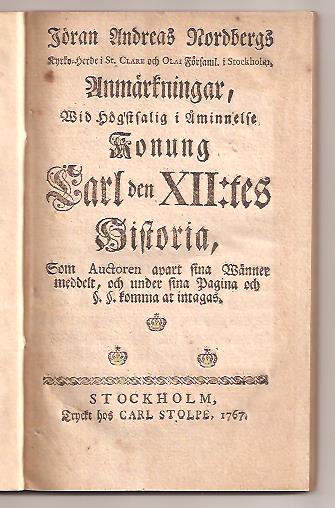 Information om Jöran Andreas Nordbergs ... Anmärkningar, wid högstsalig i åminnelse konung Carl den XII:tes historia. av Jöran Andersson. Nordberg