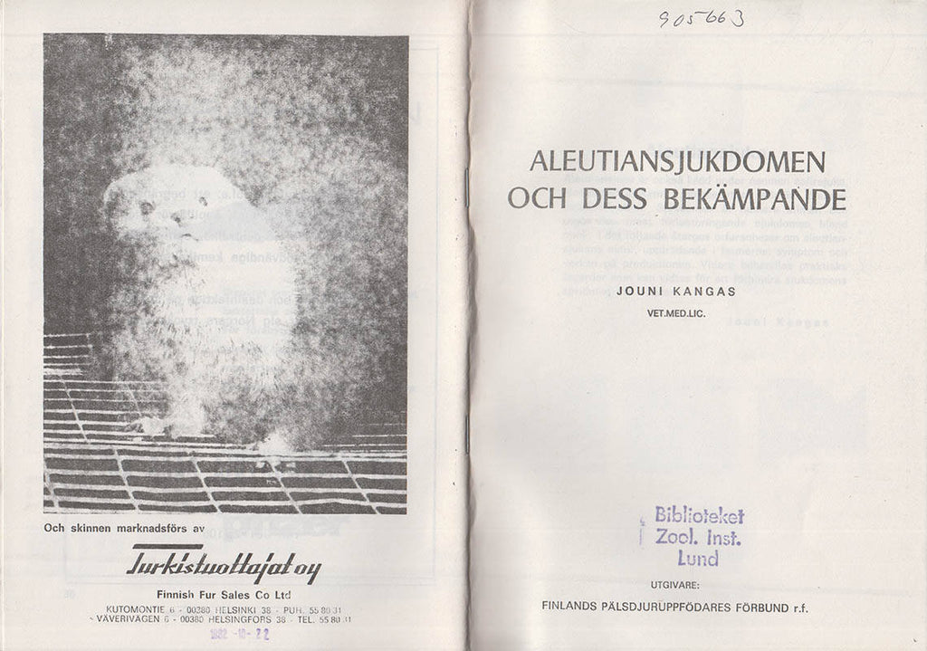 Denna bok, Aleutiansjukdomen och dess bekämpande (Mink), av Jouni Kangas, ger en grundlig genomgång av aleutisk mink-sjukdom, en långsam och progressiv sjukdom som drabbar minkar. Publicerad av Finlands pälsdjuruppfödares förbund r.f. år 1971, innehåller den 36 sidor med illustrerat material som belyser sjukdomens symptom och bekämpningsmetoder.