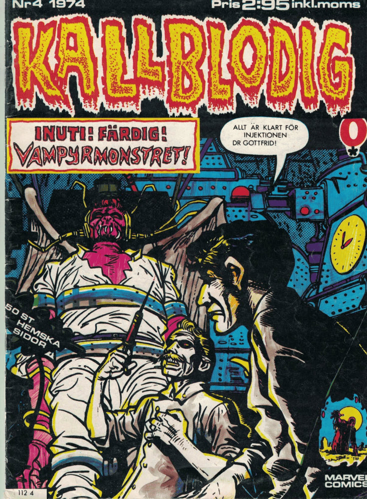 Innehåller spännande skräckserier från Marvel Comics. Serietidning, 46 sidor. Red Clown AB (Stockholm, 1974). Tidigare ägares namn på omslagets insida. Något gulnad inlaga.
