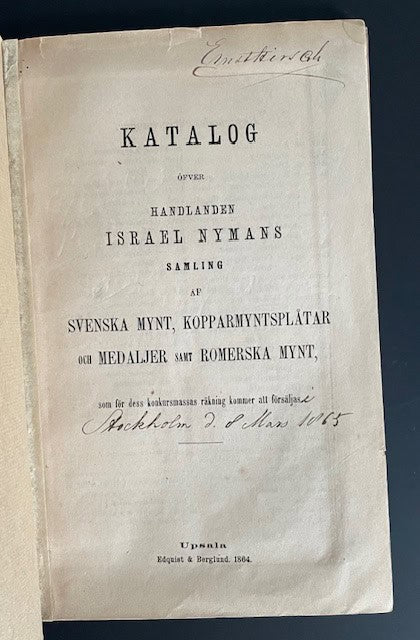 Katalog öfver handlanden Israel Nymans samling af svenska mynt, kopparmyntsplåtar och medaljer samt romerska mynt, som för dess konkursmassas räkning kommer att försäljas [i Stockholm d. 8 mars 1865] är en intressant publikation för den som är intresserad av numismatik och historia. Denna katalog, utgiven av Edquist & Berglund 1864, ger en översikt över en betydande samling av svenska mynt och medaljer.