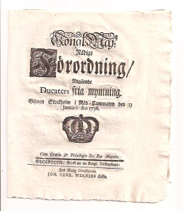 Kongl: ─ maj:tz nådige Förordning, Angående Ducaters fria myntning är en intressant historisk publikation från 1736, tryckt av Henrik Werner i Stockholm. Boken, som omfattar fyra sidor, är i mycket gott skick med fräscht papper och bevarad “reliefkänsla” i trycket. De välbevarade råkanterna bidrar till dess charm och autenticitet.
