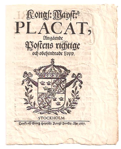 Kongl: ─ Mayst:tz placat, angående Postens richtige och obehindrade lopp är en intressant skrift från 1667 som ger en inblick i postens tidiga organisation och reglering i Sverige. Utgiven av Georg Hantsch i Stockholm, erbjuder denna text en värdefull dokumentation av hur postverksamheten bedrevs under en avgörande period i svensk historia.