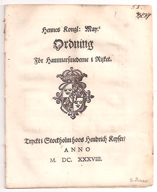 Hennes Kongl: ─ May.tz Ordning För Hammarsmederne i Riiket är en fascinerande historisk skrift från 1638, författad av Kungl. Maj:t. Denna häftade bok, som omfattar 12 sidor, är en värdefull källa för den som är intresserad av historia, mynt och numismatik.