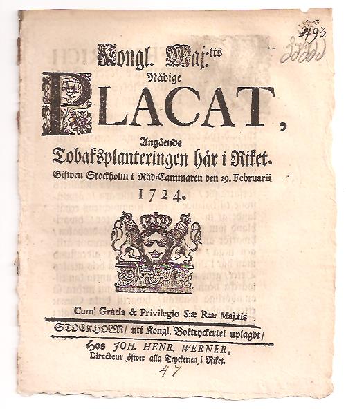 Boken Kongl. Maj:ts Nådige Placat, Angående Tobaksplanteringen här i Riket handlar om regler och riktlinjer för tobaksplantering i Sverige under 1700-talet. Den utforskar statens roll i tobaksodlingen och dess administration.